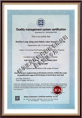 龙庆钢构彩板有限公司 目前拥有钢结构制造一级、钢结构承包一级、施工总承包二级、ISO9001质量体系认证、信用等级AAA级企业。公司总占地30万平米,在职员工1000余人,同时拥有重钢、轻钢生产基地5个,年产值20万吨。主要涉及有:钢结构系列、彩钢压型板系列、彩钢夹芯板系列、组合楼板系列等工程配套产品。广泛应用于:工业厂房、体育场馆、高铁站房、机场航站楼、超高层、畜牧行业、乳品行业、仓储冷链物流、石油化工、医药、食品加工行业、桥梁、物流等等。